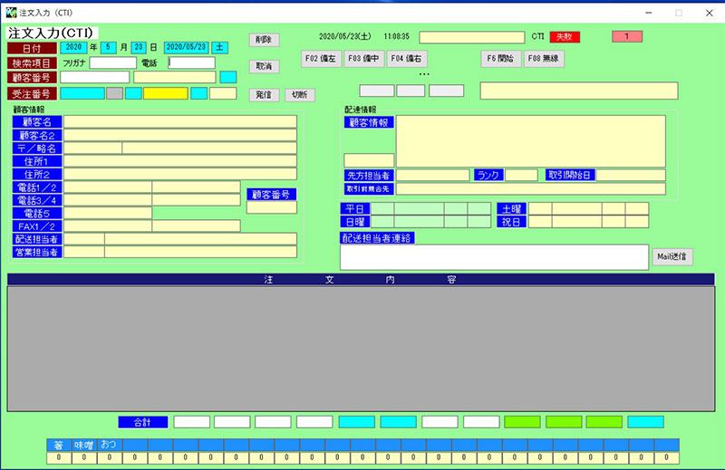 お客様情報には、今日入社した新人でも問題な無いように、顧客の情報として注意すべき点などが表示されます。注文画面は、受話器を取ると即材に個数の入力画面にフォーカスが行きます(表示される商品はお客様毎にあらかじめ登録してある内容なので、改めて、商品を選択するなどの操作を軽減しました)。