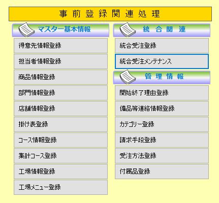 統合受注メンテナンス | 統合受注のメンテナンスは、一般的な顧客登録と同様の手順になりますが、商品の単価等、二重に登録する手間を省くのと、表示の冗長化を防ぐ意味からもこちらに別途準備してあります。 詳しくは、マニュアルを参考にしてみてください。 |
