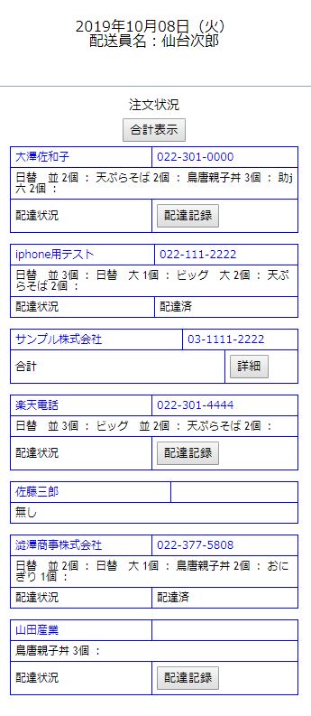 配送表は配送順毎に表示されます。配達記録ボタンをクリックすることで、当該顧客は配送済みとなります。